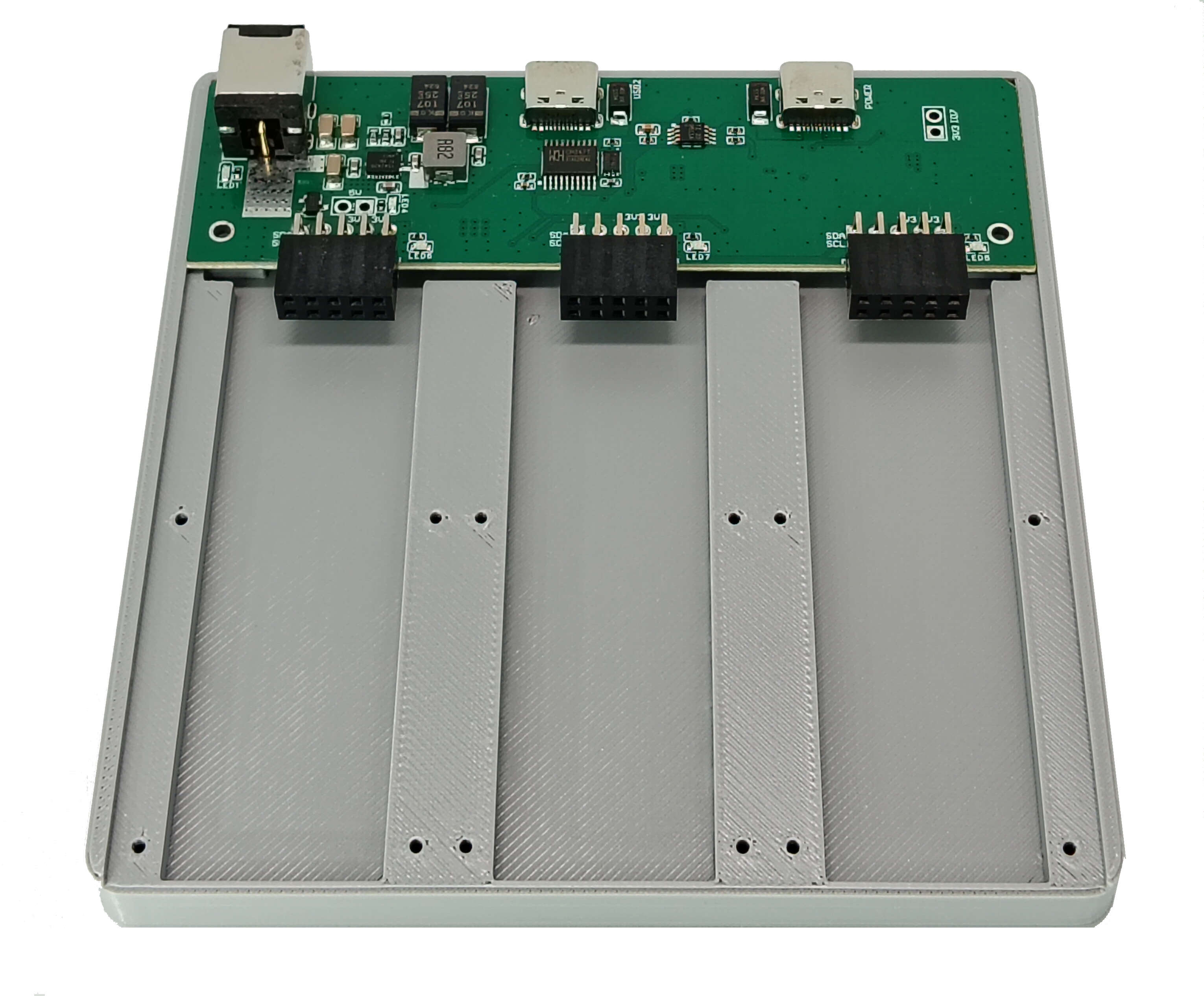 # 3rd-Gen Optical Module Programmer Mainboard - Product Specifications - **Up to 5x Faster Than the Previous Generation**: The 3rd-generation optical module programmer mainboard delivers a maximum speed boost of 5 times compared to its predecessor, significantly enhancing programming efficiency. - **Support for Low-Power Mode Interface Boards**: Compatible with X3 series expansion boards, and also backward compatible with X2 series expansion boards for versatile application scenarios. - **Support for "Verify Write - Enhanced" in IICHIB-C1 Software**: Enables advanced write verification functionality in the IICHIB-C1 software, ensuring higher data accuracy during programming. - **Dual Type-C Simultaneous Power Supply**: Each Type-C port supports a maximum input of 5V 3A, providing stable and flexible power options. - **DC Power Supply with Power Detection**: Supports DC power input (maximum 5V 10A). When using a DC power source, the Type-C ports will only function for data transmission. - **3 Interface Board Expansion Ports**: Each port supports a maximum output of 3.3V 10A (current output depends on input current), facilitating connection with multiple external devices. - **UART Serial Port Support**: Equipped with UART serial port for reliable serial communication, suitable for debugging and data transmission. - **5V Power Supply Support**: Compatible with 5V power input, meeting common power supply requirements in various working environments.